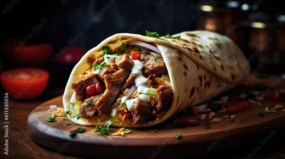 Delicious shawarma served on wooden board on table in cafe. Grilled pita wrapping chicken meat and fresh vegetables with sauce generative AI. #611330056
