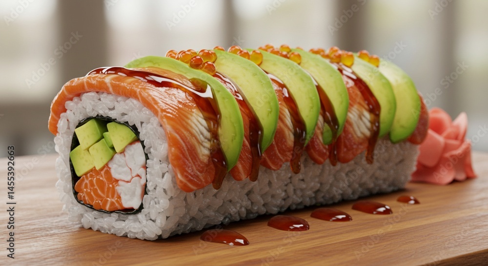 Delicious sushi roll with salmon avocado and tobiko garnish red raw art soy food meal rice high fish #1455392663