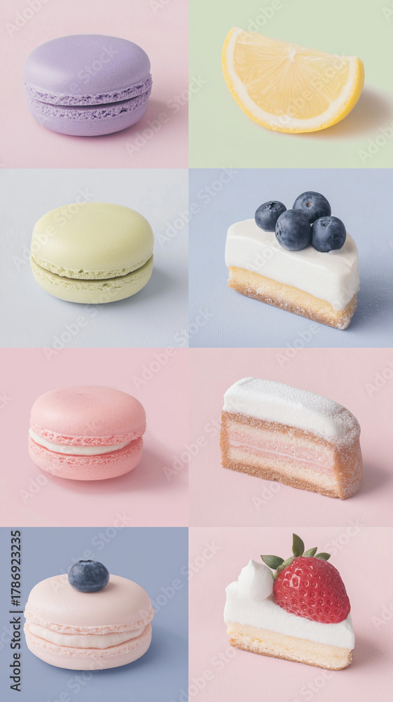 Delightful assortment of pastel colored macarons and slices of cake, each with unique topping like blueberries and strawberries, arranged against soft pastel backgrounds. image evokes sense #1786923235