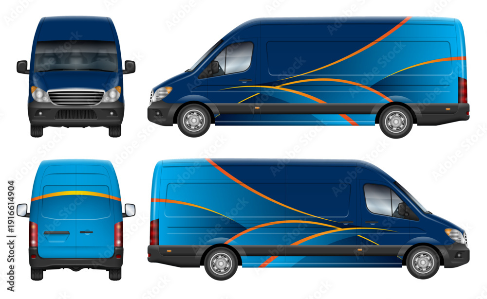 Delivery cargo van wrap vector mockup view from side, front, rear. Perfect for vehicle branding, corporate identity and design concepts. All elements in the groups are in separate layers #1916614904
