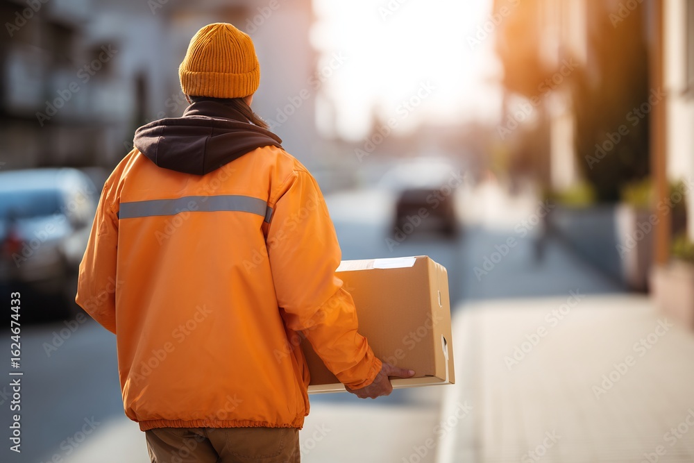 Delivery driver walking parcel photographed from behind on street urban delivery scene #1624674433