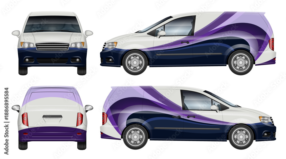 Delivery minivan wrap vector mockup shown from side, front, rear view. Perfect for corporate identity, vehicle branding and design concepts. All elements in the groups are in separate layers #1886895584