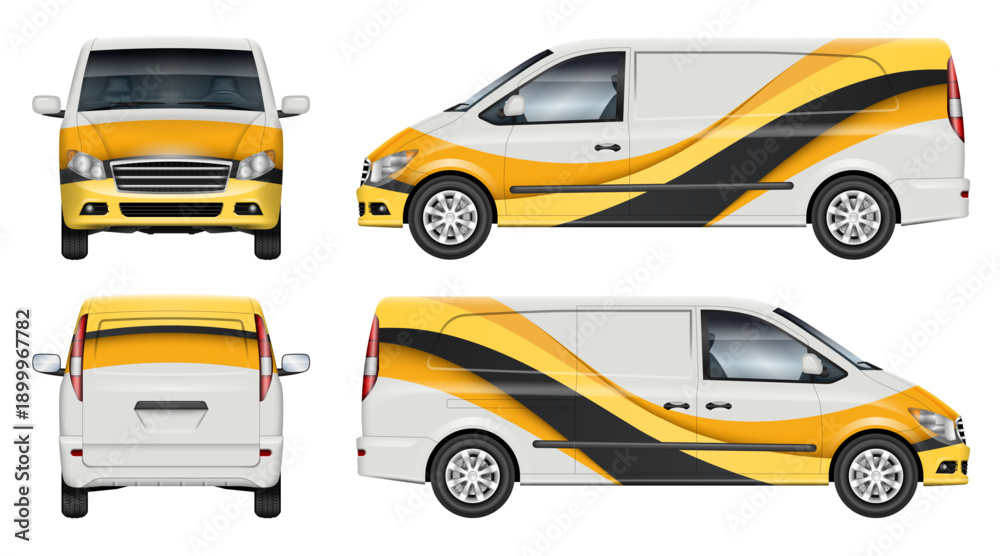 Delivery minivan wrap vector mockup shown from side, front, rear view. Perfect for corporate identity, vehicle branding and design concepts. All elements in the groups are in separate layers #1899967782