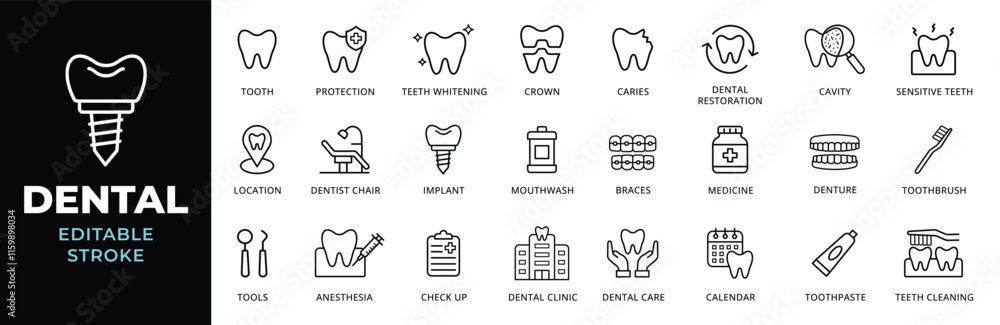 Dental icon set. Dentistry, tooth, toothbrush, implant, braces, teeth whitening, oral care icons. Dentist clinic outline icons collection. Editable stroke #1159898034