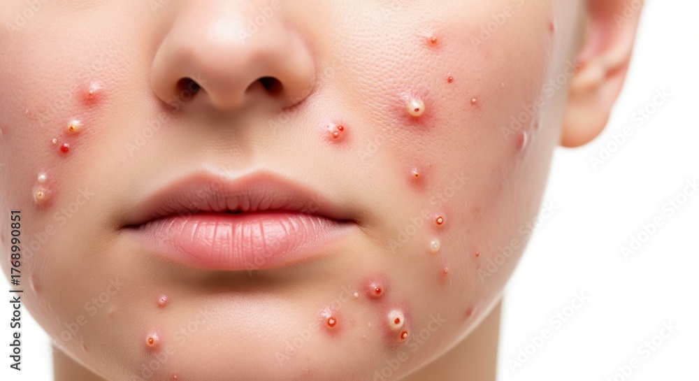 Dermatology close-up of young woman’s face with acne and red pimples on cheeks and chin, isolated on white background, skin condition photo #1768990851