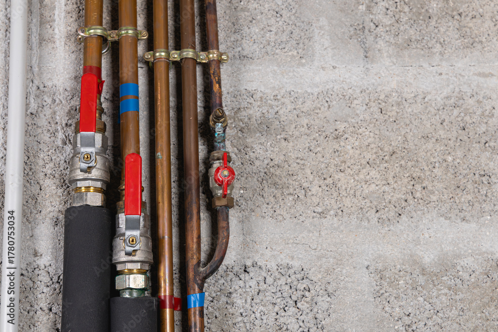 Des tubes de plomberie en cuivre avec des vannes. #1780753034