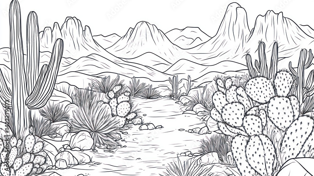 Desert creek, cacti, mountains, arid landscape, coloring page #1422279273