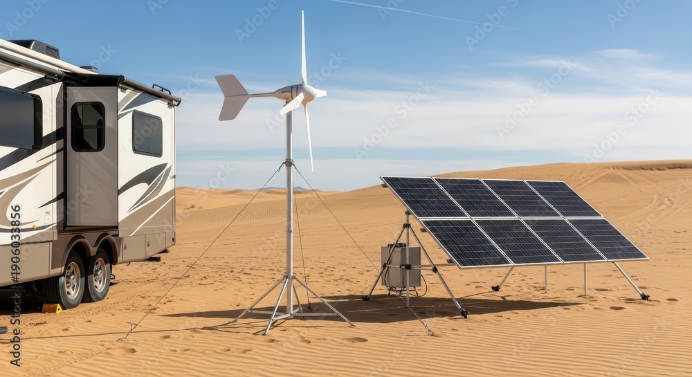 Desert renewable energy: wind turbine and solar panels beside mobile home for sustainable off-grid living #1906033856
