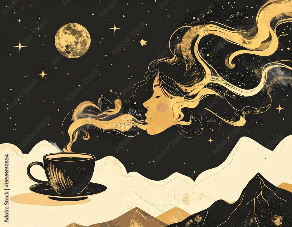 Design für Kaffeewerbung, ein Frauenkopf atmet den Duft von Kaffeedampf ein #1959890854