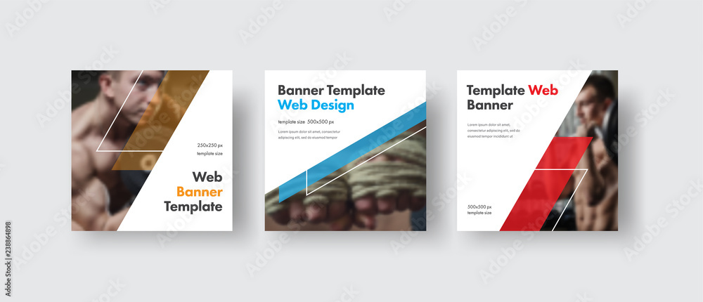 Design white square web banners for social media with place for photo, diagonal transparent color elements #238864898