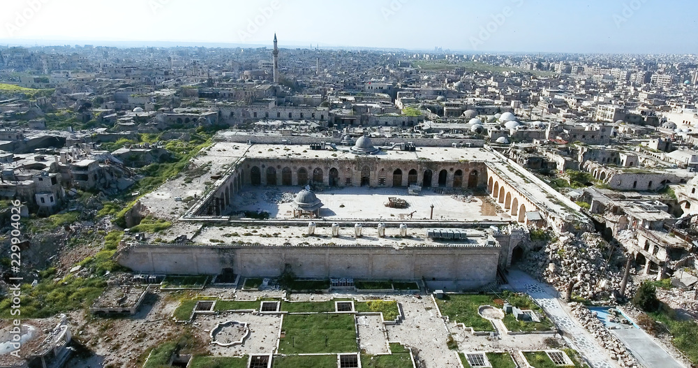 destroyed mosque of Aleppo in aerial view, filmed by a drone, syria #229904026