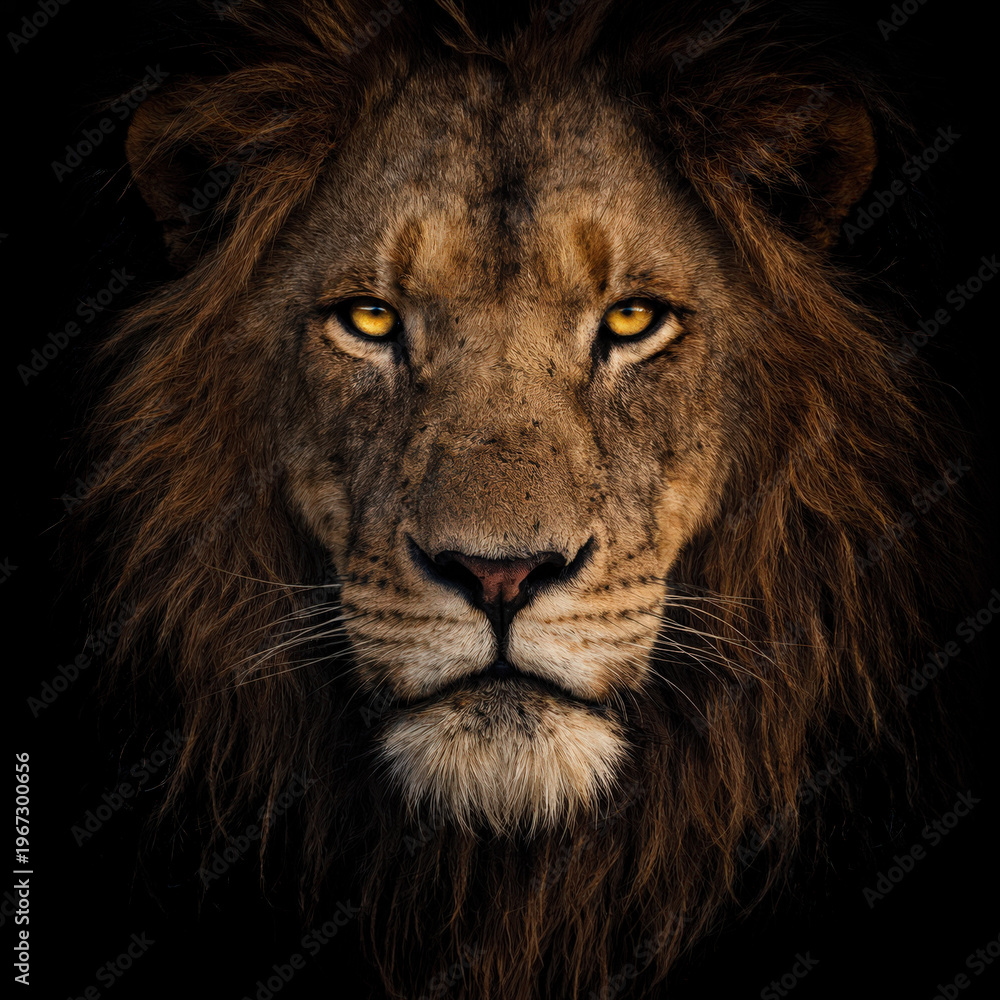 Detail of the face of an adult lion, dark mane and deep gaze. #1967300656