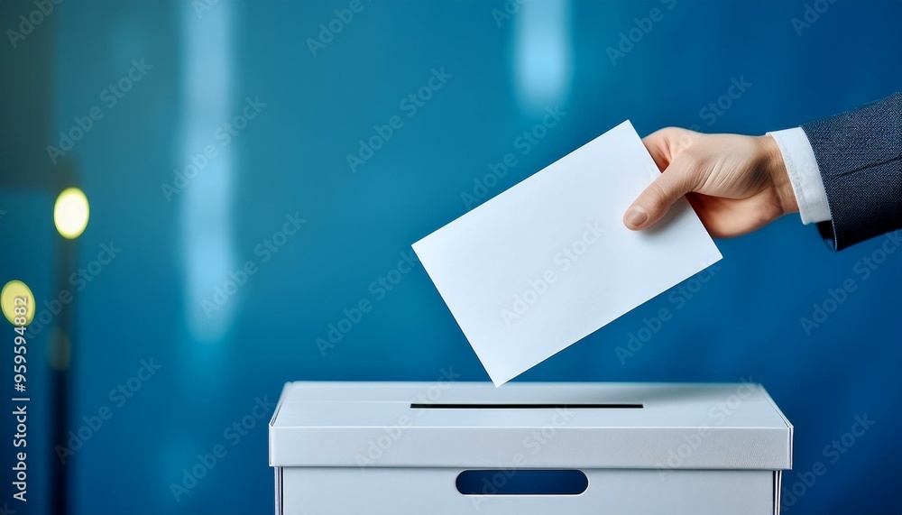 Detail von einer männlichen Hand, die einen Wahlzettel in die Wahlurne reinwirft #959594882