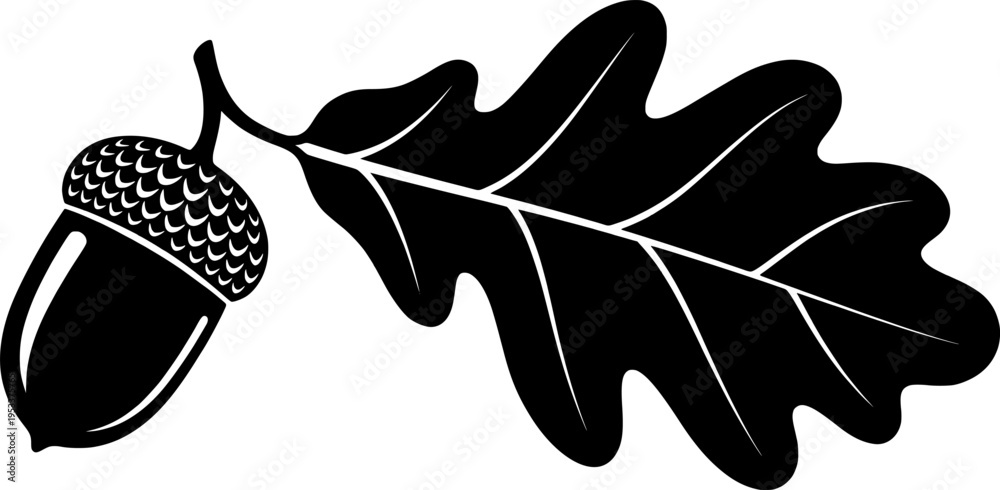 Detailed black and white acorn with oak leaf illustration. Vector illustration #1953375765