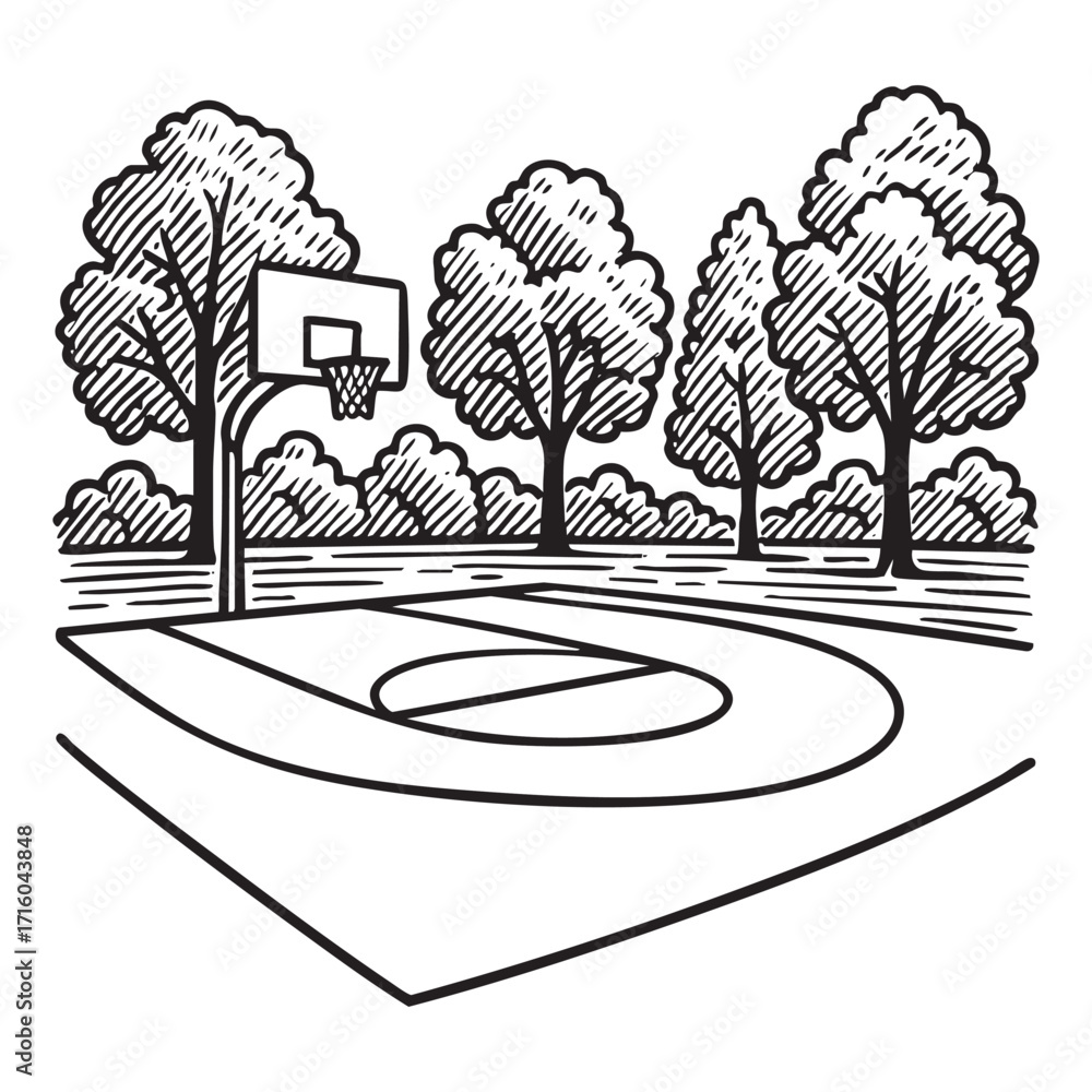 Detailed Black and White Engraving of basketball field outdoor #1716043848