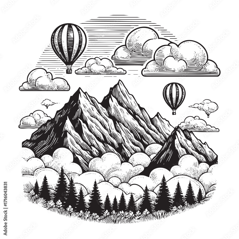 Detailed Black and White Sketch of air balloon flying over mountain in Black and White #1716043831