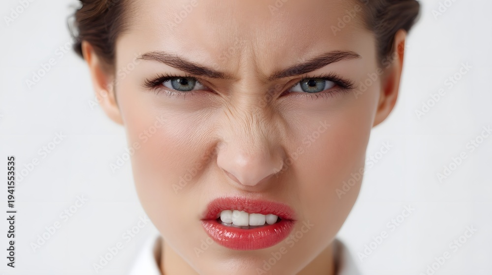 • #1941553535 Detailed close up beauty portrait of a woman expressing fierce anger with intense eyes slightly bared teeth wrinkled nose and glossy lips on a white studio background