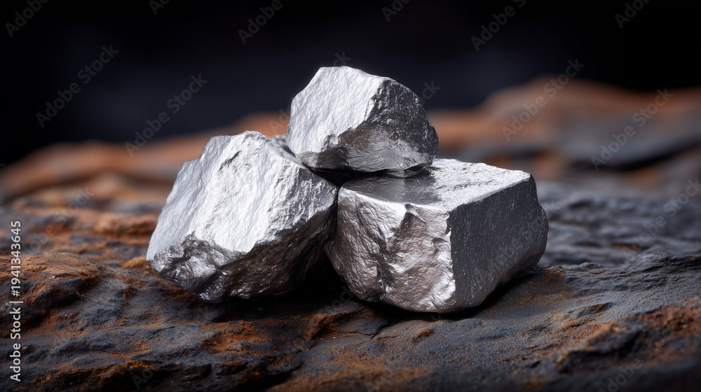 Detailed close-up of platinum nuggets resting on a textured dark rocky background, metallic surfaces catching soft lighting, representing wealth, mining discovery, and economic val #1941343645