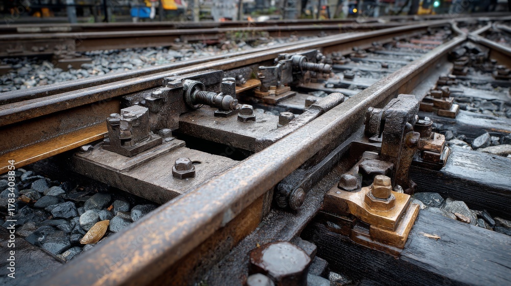 Detailed close-up of rusty railway track mechanisms showing metal components, bolts, and wooden ties in a vintage train station setting #1783408854