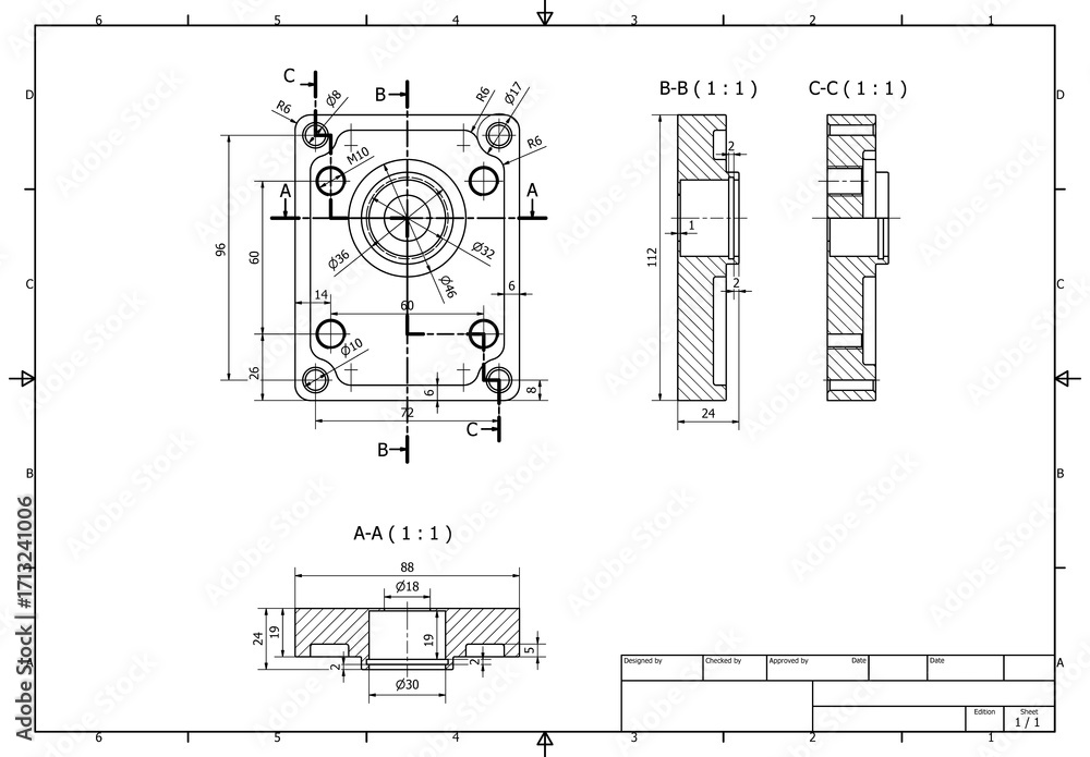 detailed engineering drawing of a mechanical component, housing or mounting plate, various views and dimensions CAD design #1713241006
