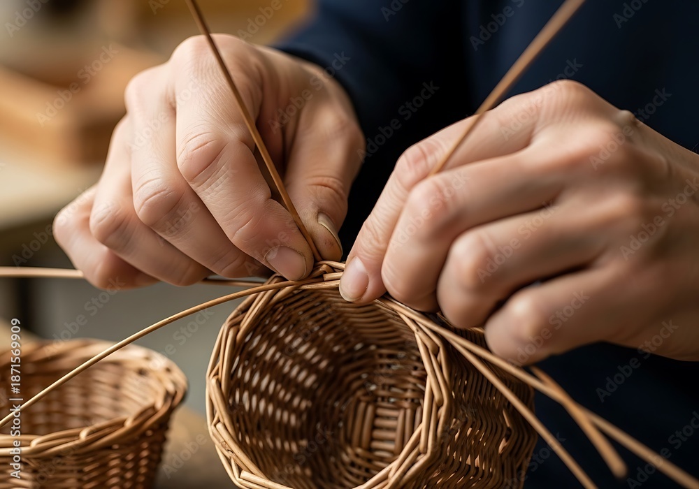 Detailed hands weaving a small willow basket with artistic mastery #1871569909