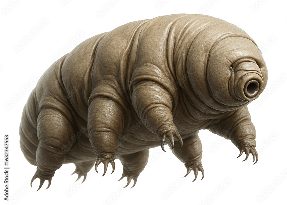Detailed illustration of a tardigrade, a microscopic water-dwelling organism, showcasing its distinct segmented body and clawed limbs on transparent background. #1632347553
