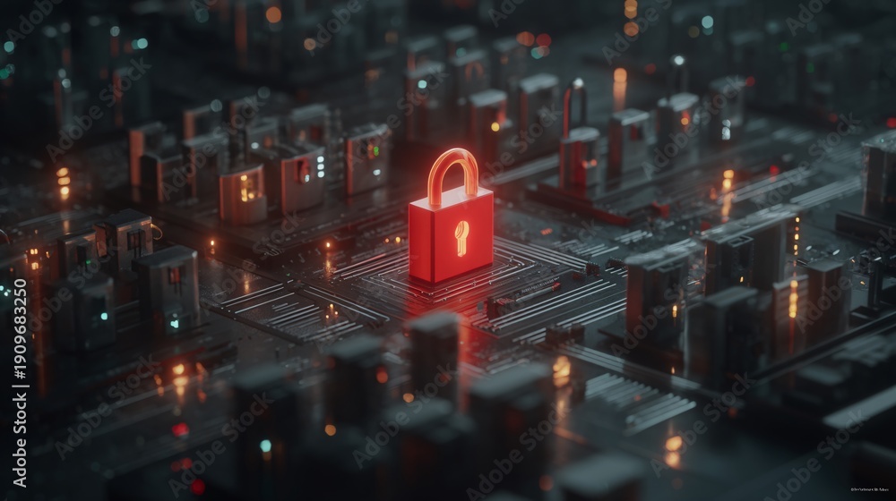 detailed illustration showing a digital security breach where a bright red unlocked padlock stands out among rows of muted secure locks. The contrast emphasizes exposed data within an otherwise #1909683250