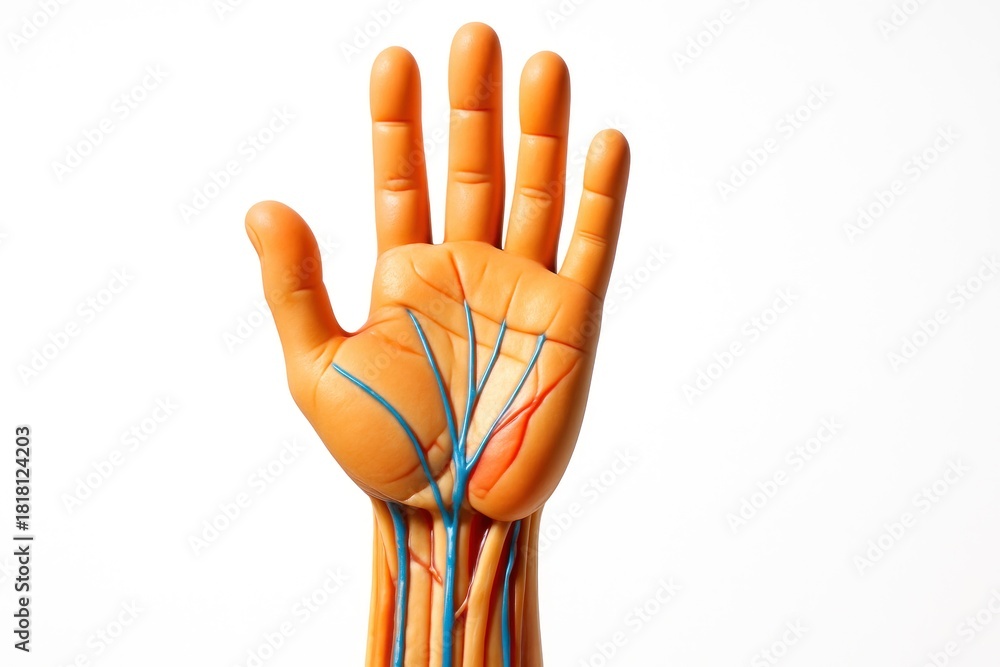 Detailed model of a human hand, palm up, revealing veins and arteries, on white #1818124203