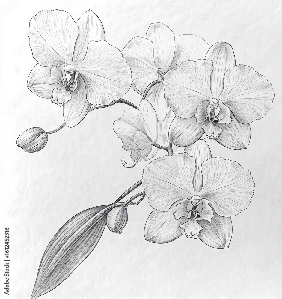 Detailed pencil sketch of a blooming orchid with multiple blossoms and buds on delicate stems conveying elegance and natural beauty #1612452316