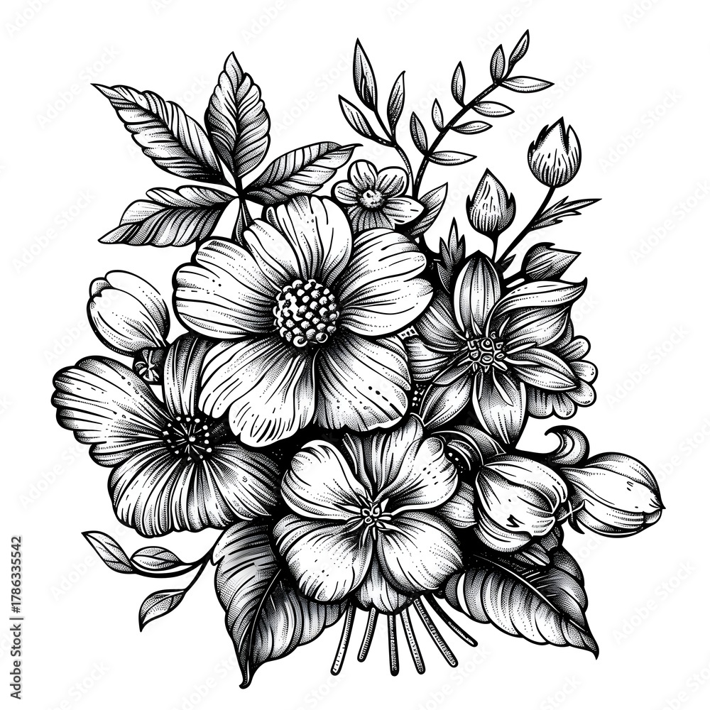 Detailed vector line engraving of a wildflower bouquet with intricate floral elements and leaves #1786335542