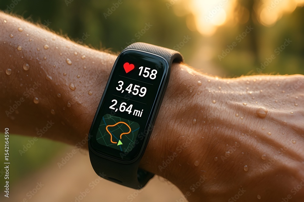 Detailed View of a Smart Fitness Tracker Displaying Live Stats During a Morning Jog #1542164590