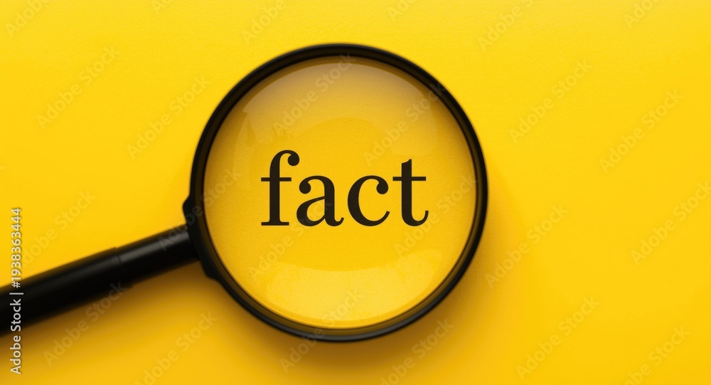 Detailed view of fact word through magnifying glass on sunlit yellow smooth background #1938363444