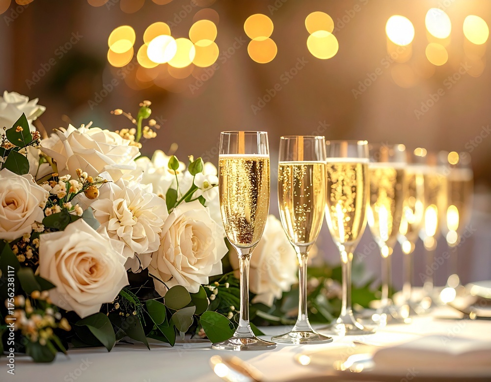 Detalle de una mesa decorada para graduación, copas de champaña, centros de flores blancas y doradas, luces suaves de fondo #1756238117