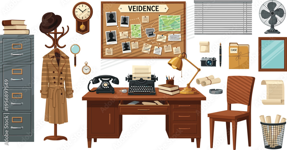Detective Office Interior Furniture Collection with Evidence Board, Desk, Filing Cabinet, Chair, Coat Rack, Fan, and Investigation Workspace Elements #1956897549