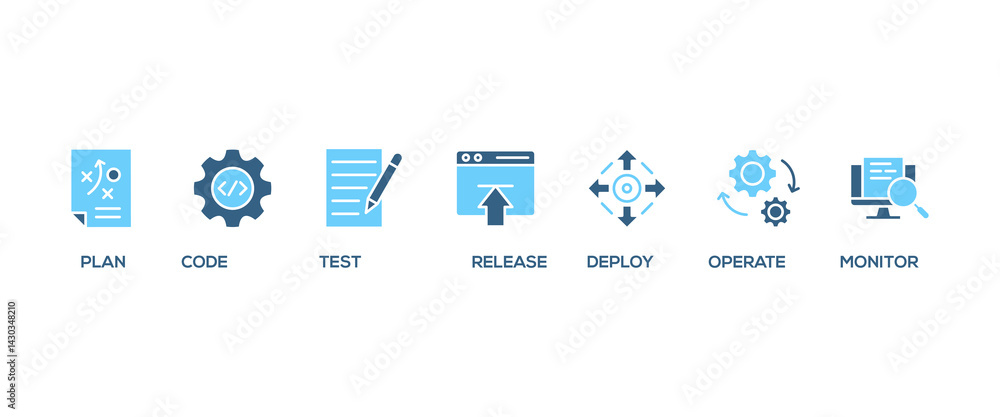 DevOps banner web icon set vector illustration concept for software engineering and development with an icon of a plan, code, build, test, release, deploy, operate, and monitor #1430348210