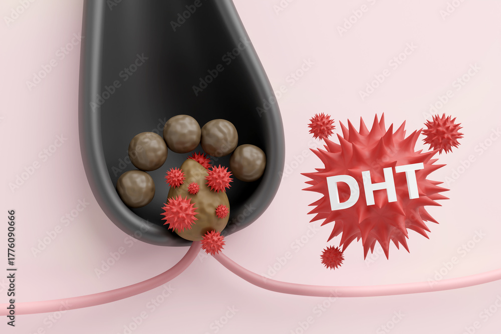 DHT hormone attacking the dermal papilla causing hair follicle miniaturization 3D render #1776090666