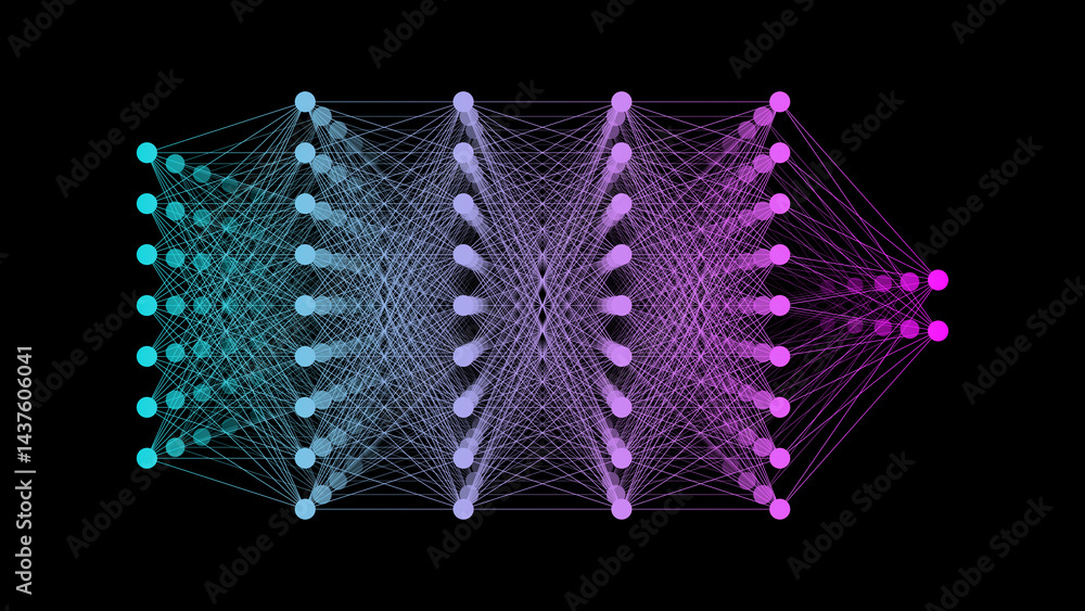Diagram of an artificial intelligence neural network architecture, showcasing interconnected nodes and layers — ideal for illustrating AI principles and machine learning concepts. #1437606041