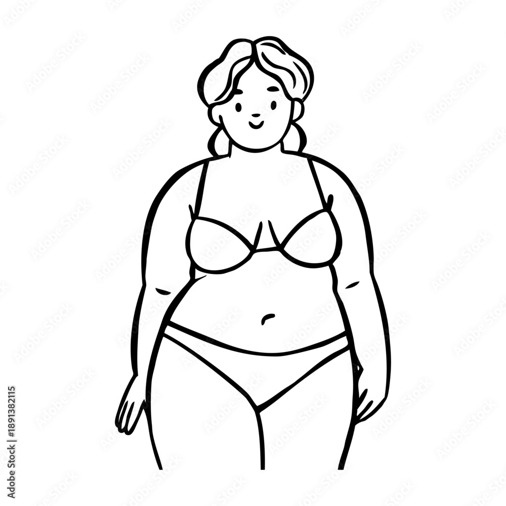 Dibujo sencillo con líneas de mujer con traje de baño o ropa interior con sobrepeso de pie #1891382115