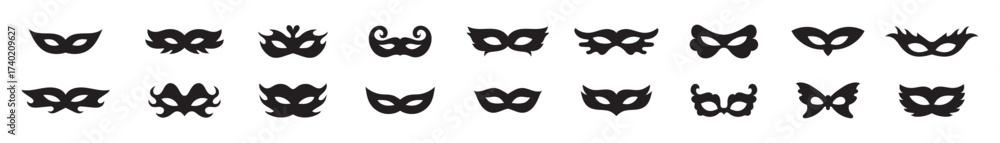 Different Mask silhouette isolated on transparent background Masquerade vector for apps or web party superhero carnival villain or burglar icon in flat set. masks icons for costume party. eps 10 #1740209627