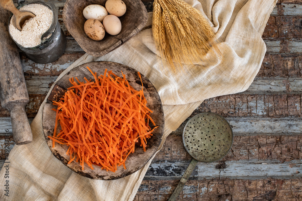 Different types of uncooked pasta on rustic wooden table, in the spoons, cutting board and bowls #1792031316