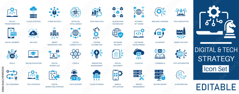 Digital and Tech Strategy solid icon set. Featuring Artificial Intelligence, Cyber Security, Cloud Computing, and Big Data. Solid glyph vector icons for IT, software, and innovation projects. #1940152530