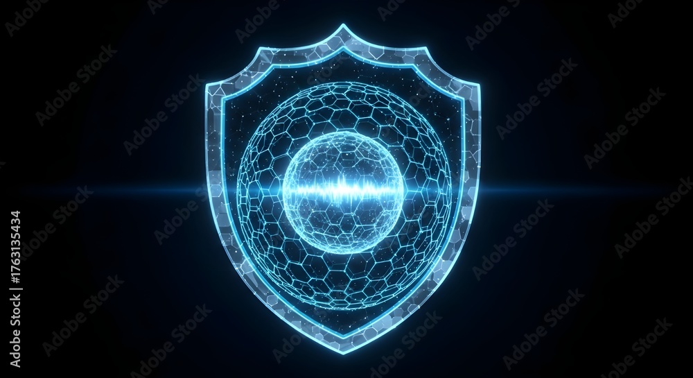 Digital Blue Cyber Security Shield Icon with Glowing Abstract Honeycomb Sphere isolated PNG with Transparent Background #1763135434