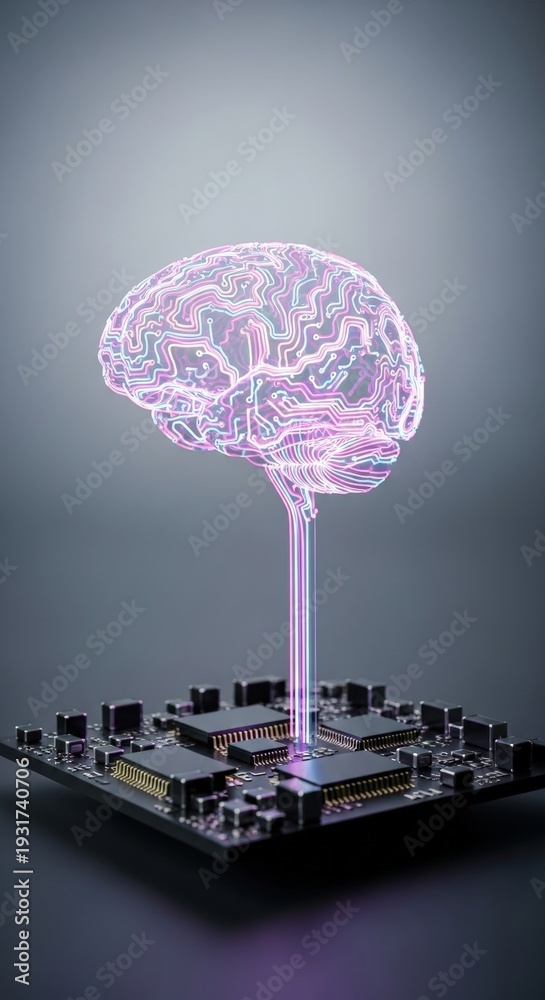 Digital brain with glowing circuits connecting to a computer chip. Artificial intelligence and machine learning concept for robotics. #1931740706