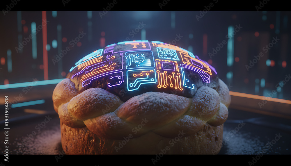 Digital bread with glowing circuit patterns on top, a fascinating blend of technology and tradition. Bread features intricate designs with vibrant colors that highlight modern innovation. #1931934818