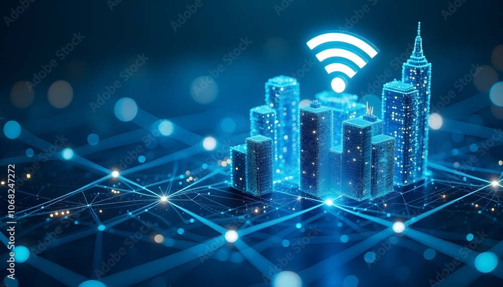 Digital cityscape with wireless connectivity, representing smart city infrastructure. #1068247272