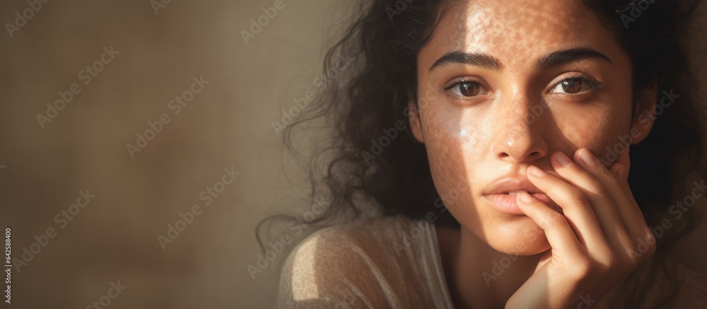 Digital composite of an Indian woman checking her reflection on International Skin Pigmentation Day with text and copy space Emphasizing skincare awareness and treatment for pigmentation #642588400