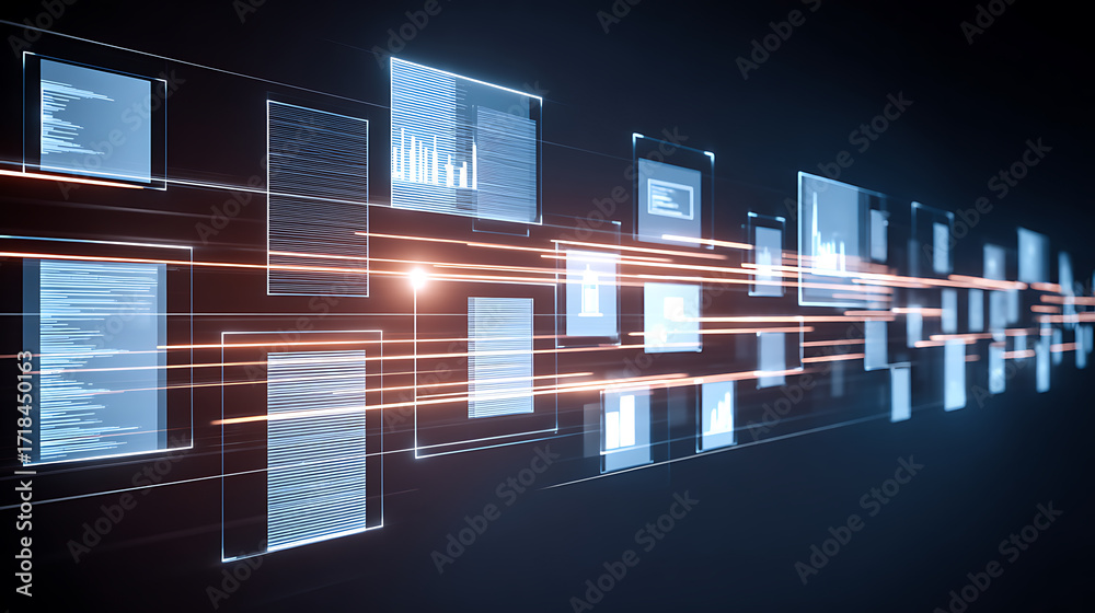 Digital data flow visualization with glowing panels and streaming information on a dark background #1718450163