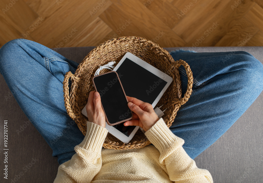 Digital detox from gadgets, social media and internet device addiction with woman on sofa at home putting away phone and tablet in basket for healthy lifestyle balance and mental health. #1922707741