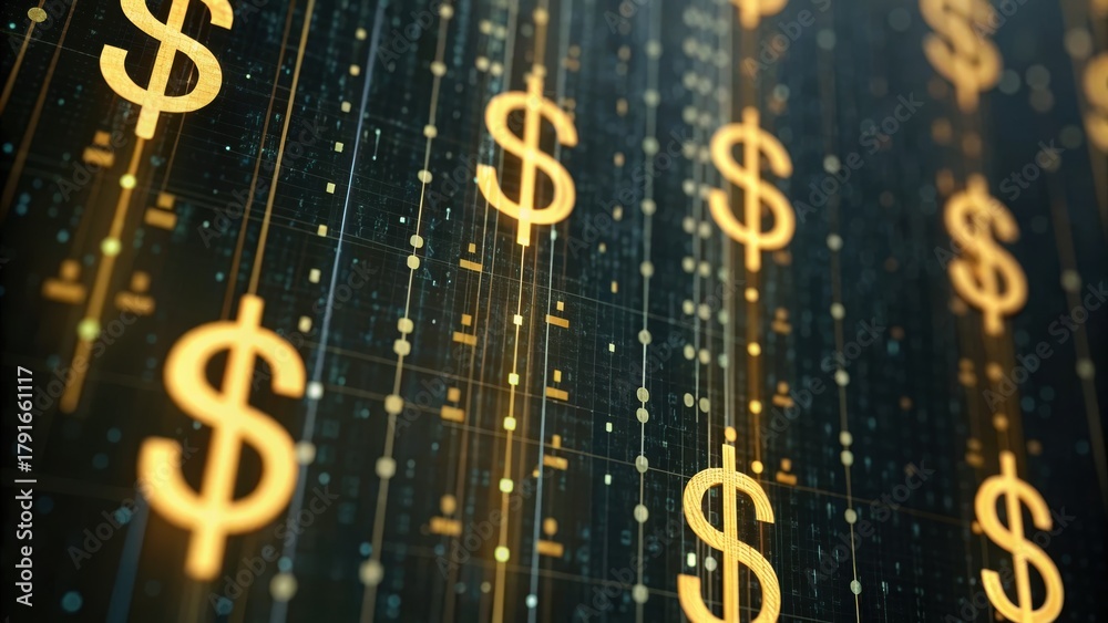 Digital dollar signs cascade against a dark background, creating a futuristic financial theme with a sense of technology and wealth. #1791661117