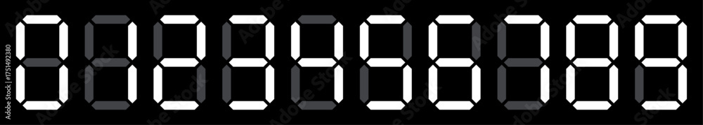 Digital electronic figures icon set. Seven segment digital numbers. LED digits display icon. Digital display number set for sign, alarm, calculator, clock, light, electronic, computer, watch, time. #1751492380